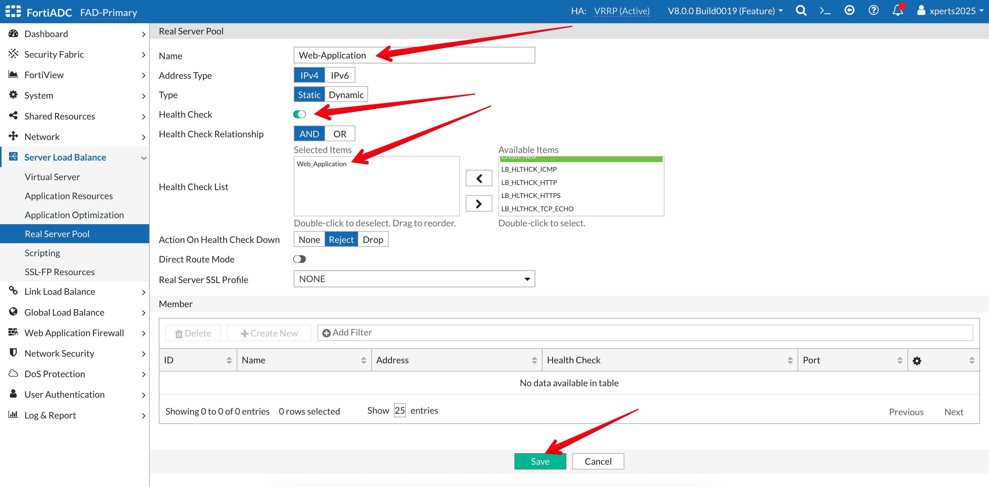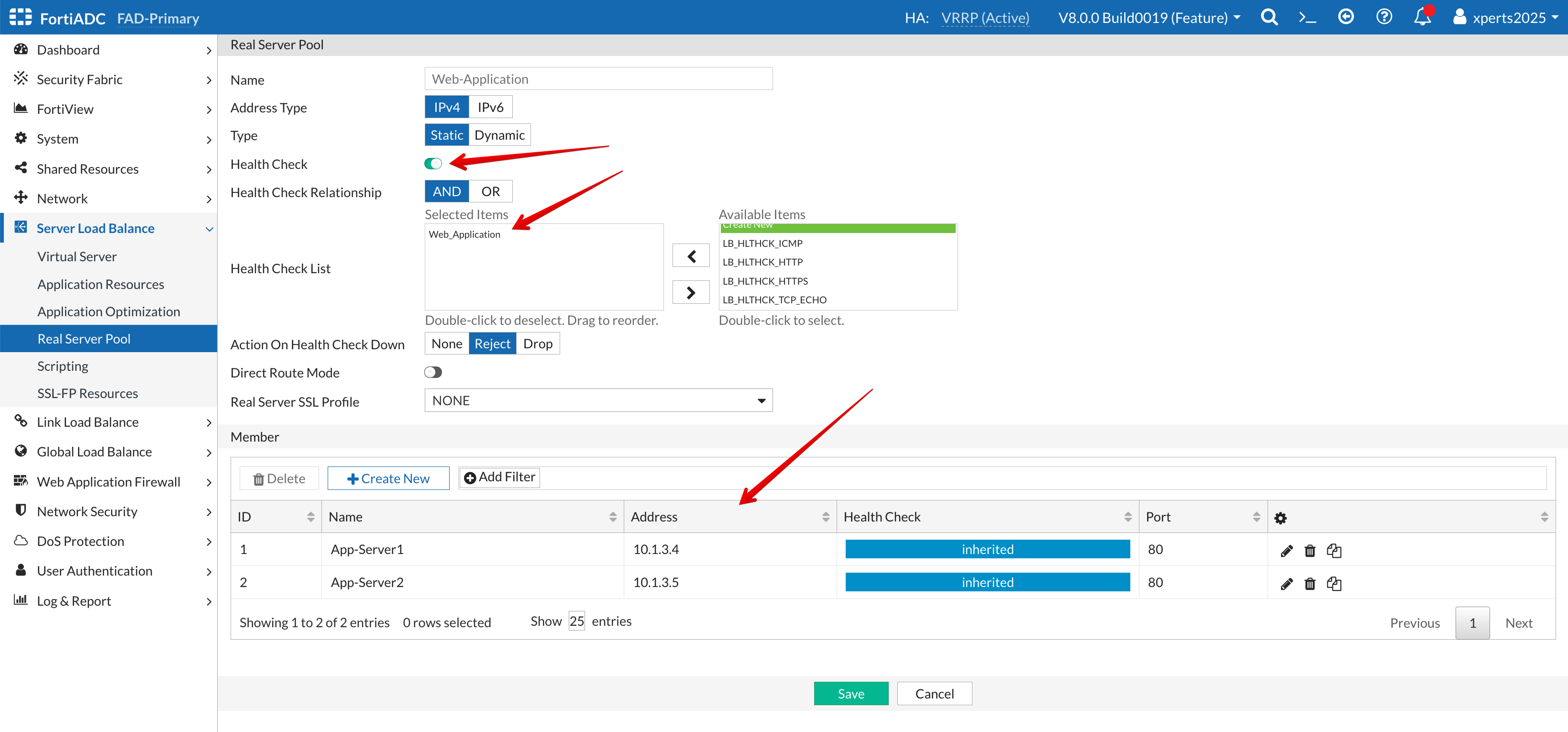 Once a server is added to the pool we will need to define a health check so the FortiADC can determine the status or availability of a server before forwarding a request to the server.