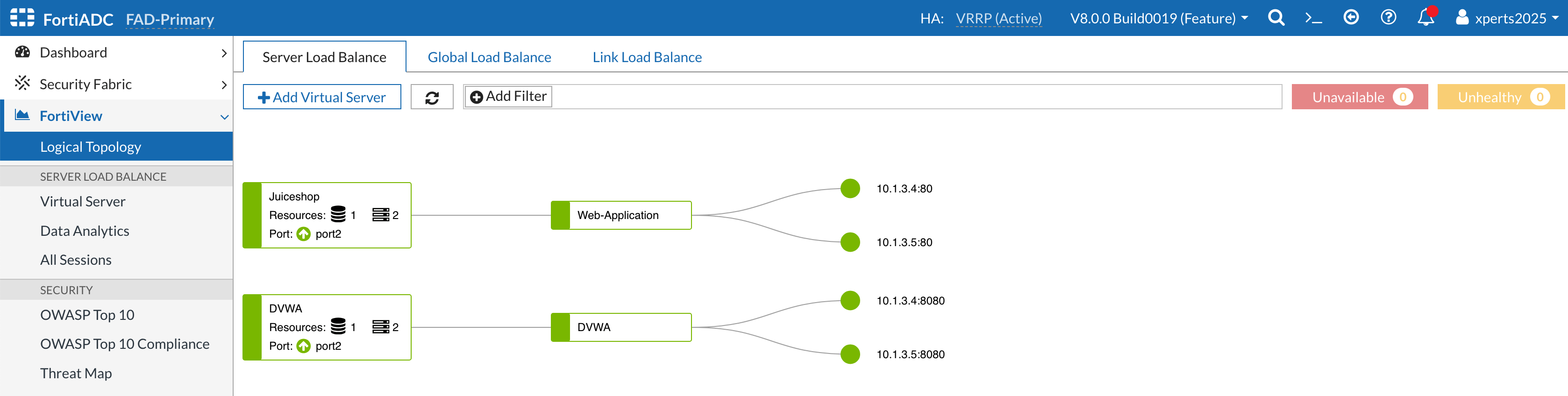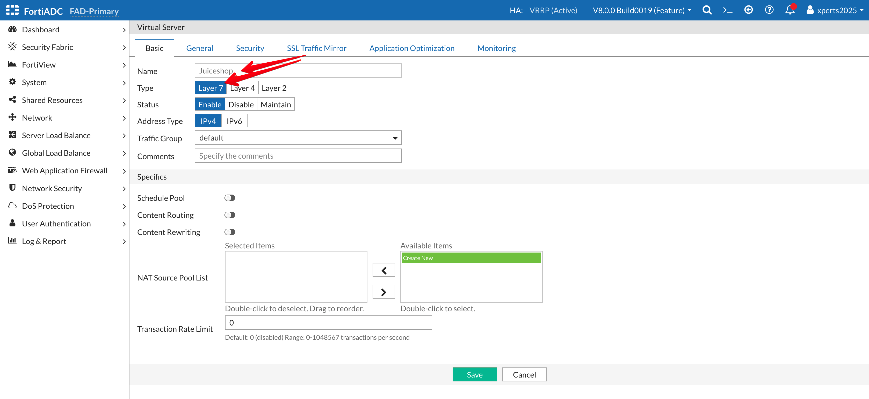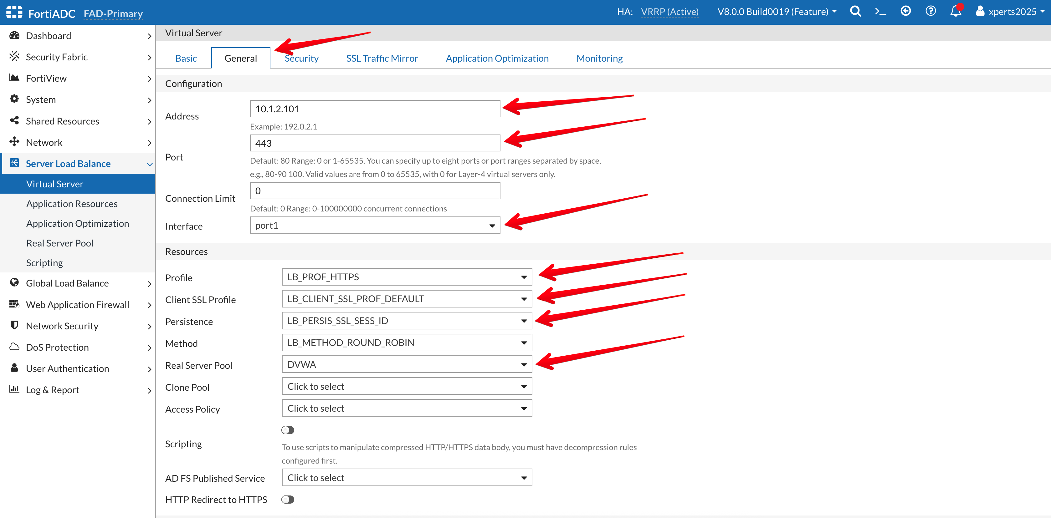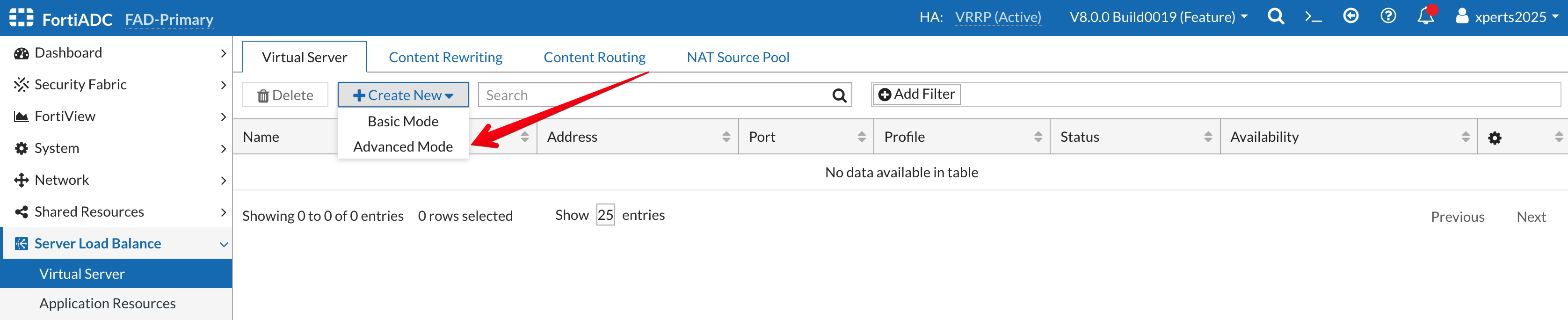 The next step is to configure a virtual server, which defines the type of traffic FortiADC will manage and how it will be processed. For this exercise, we will create two virtual servers, one for each of our web applications, while using the default settings wherever possible.