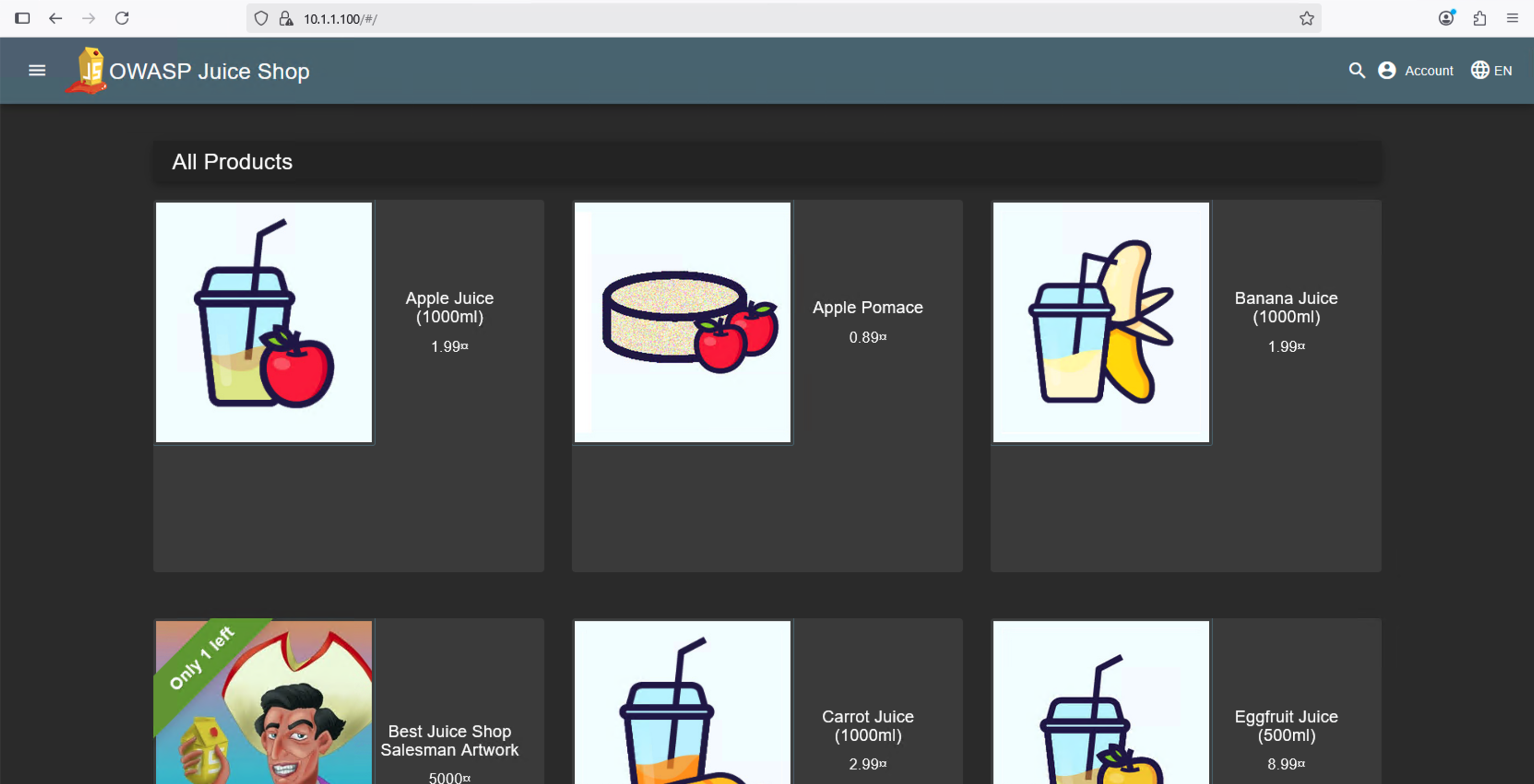 - Open Firefox and go to the Juiceshop application: https://10.1.1.100