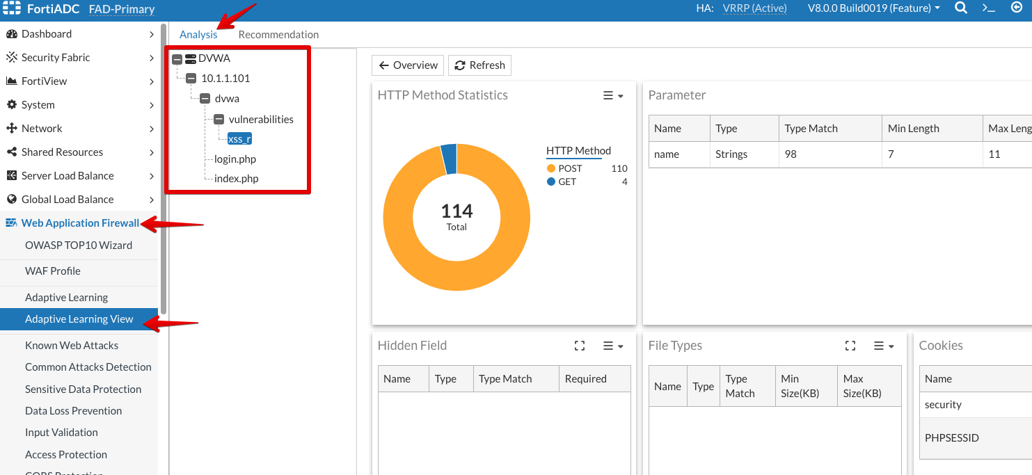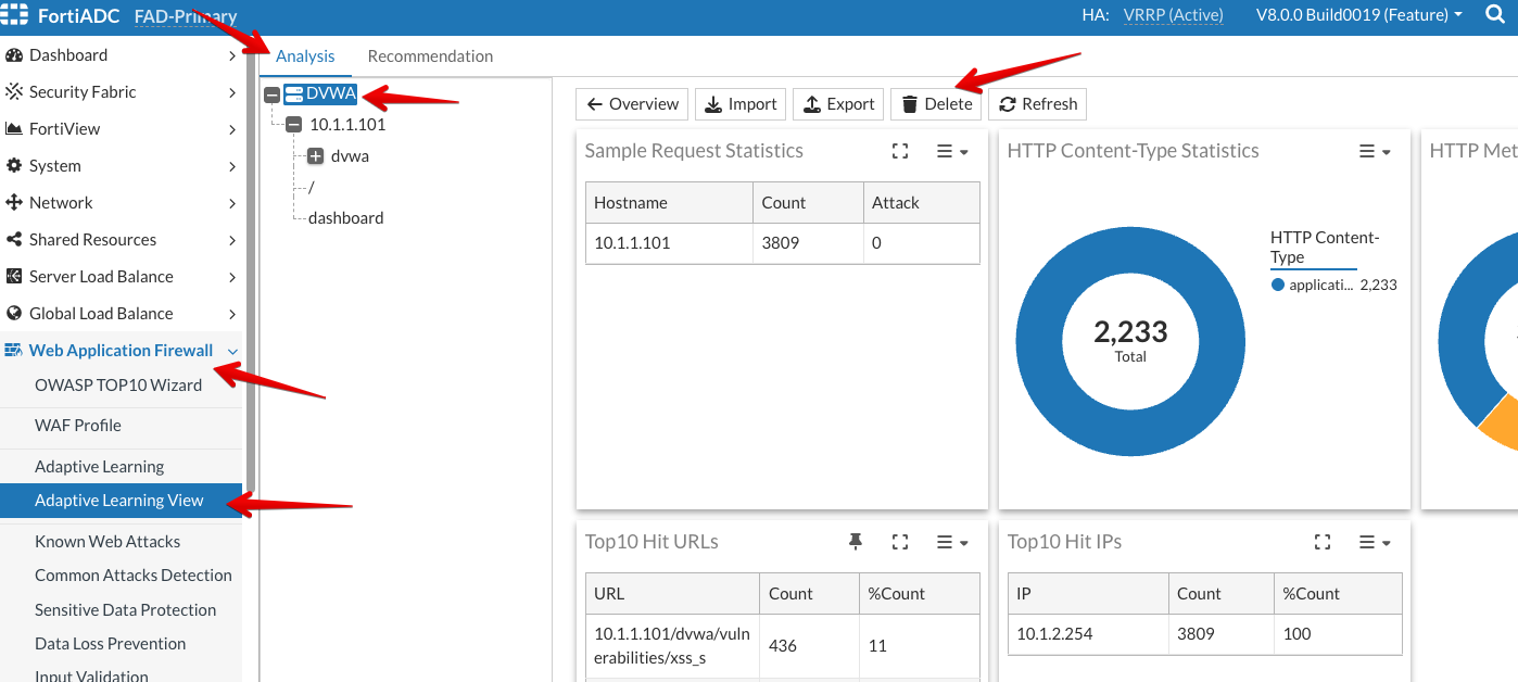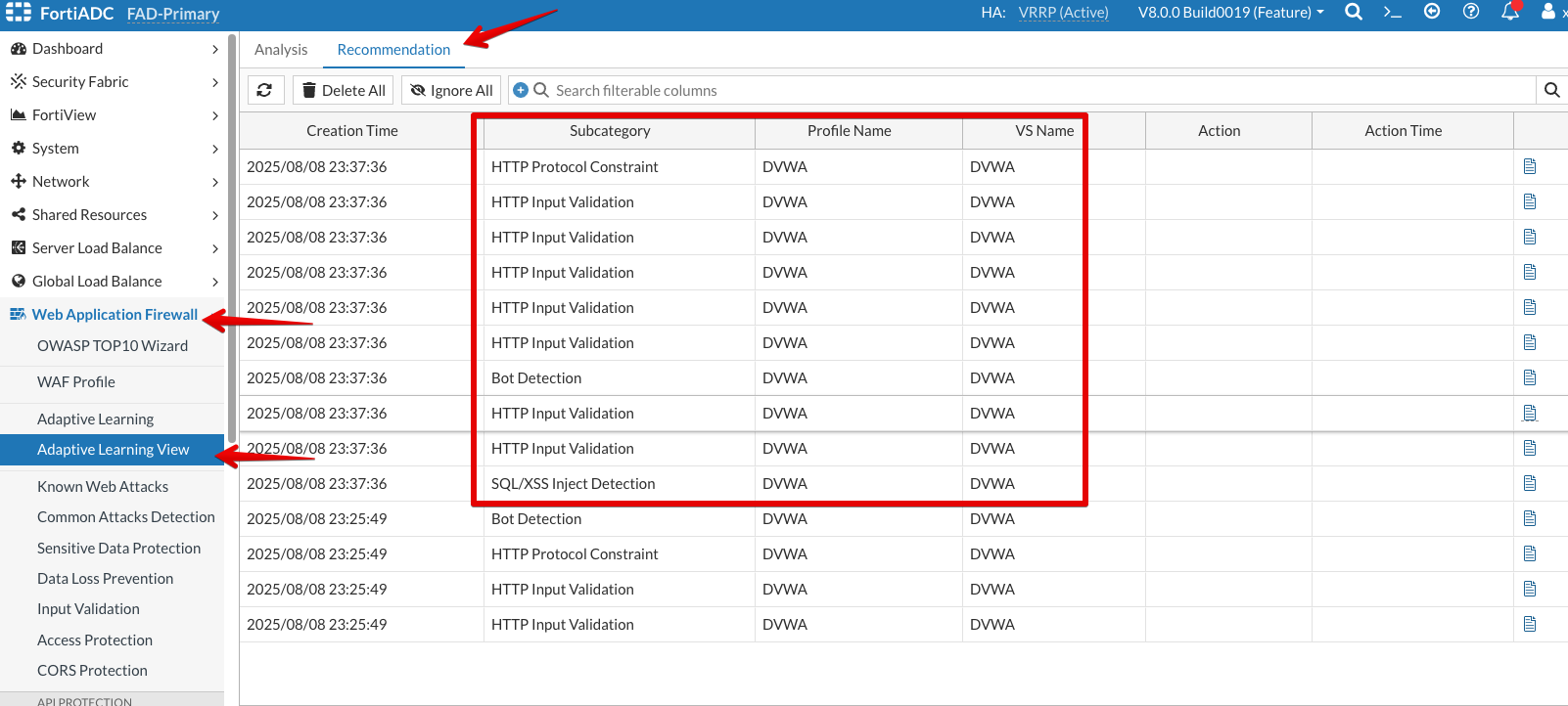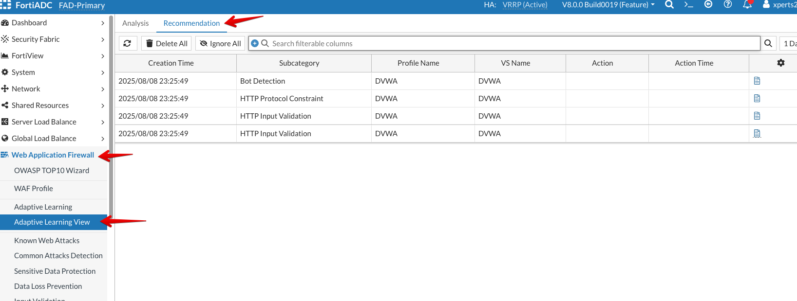 - Go back to the FortiADC (FAD-Primary) console and click Web Application Firewall → Adaptive Learning View and observe the Adaptive Learning data under Analysis and Recommendation.