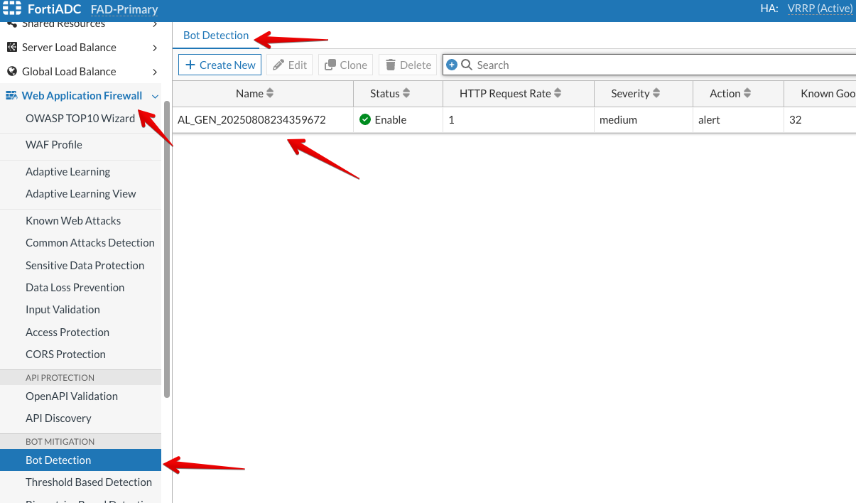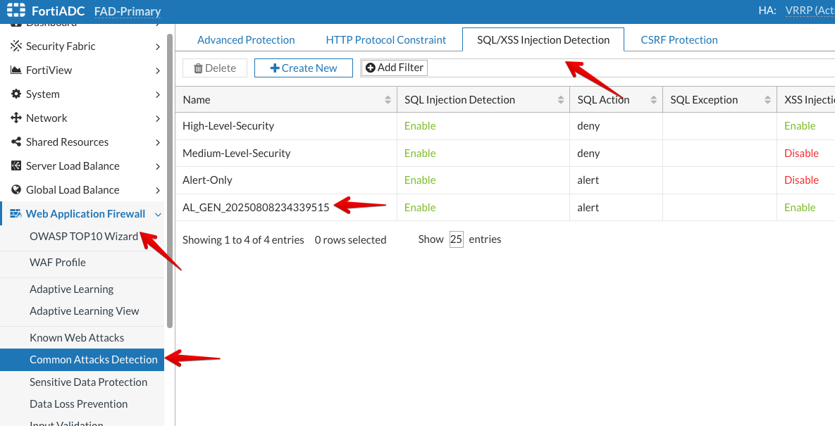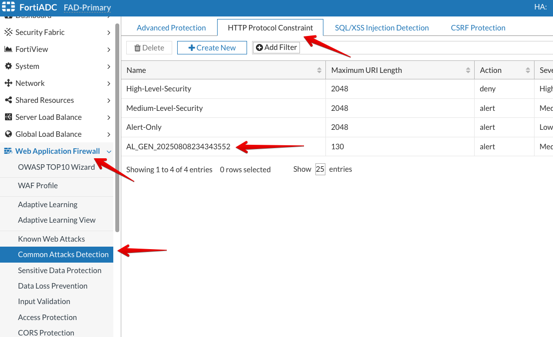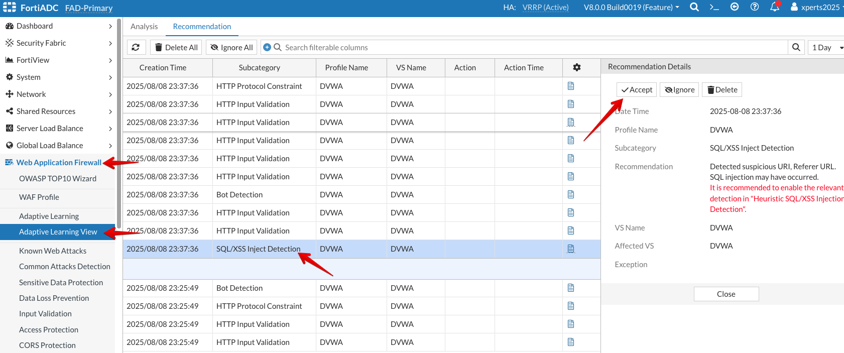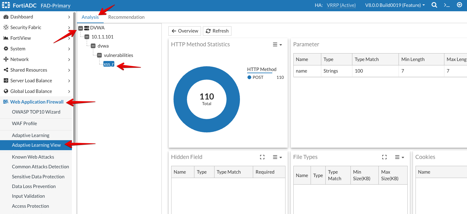 - Go back to the FortiADC (FAD-Primary) console and click Web Application Firewall → Adaptive Learning View and observe the Adaptive Learning data under Analysis and Recommendation.
