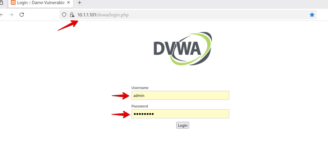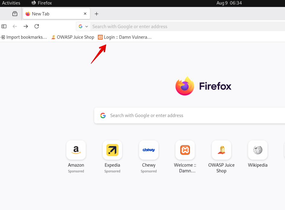 - Go back to the RDP connection on the Client, click on Activities in the top left corner and open Firefox, using the bookmark go to DVWA