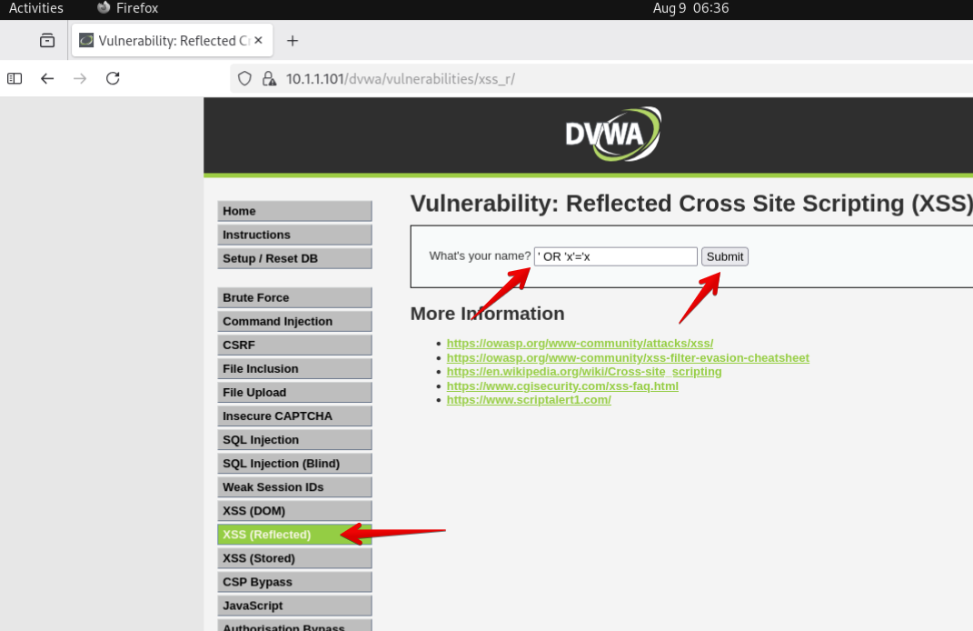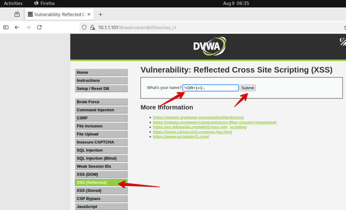 - Go to XSS (Reflected) from the left menu and insert an SQL Injection twice,