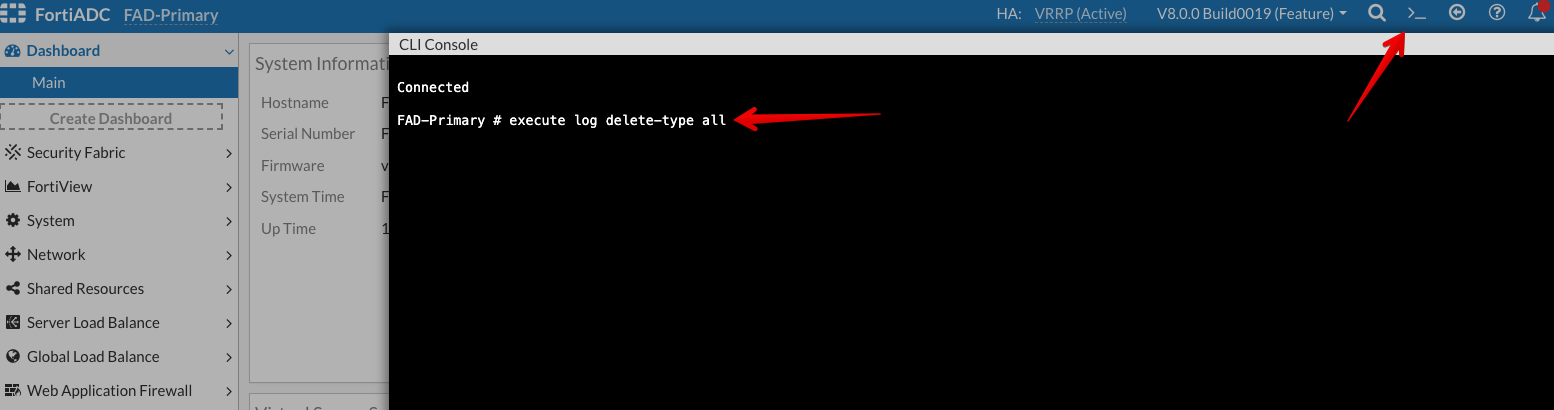 - To do that, go to FortiADC CLI by clicking “>_” towards the top right corner and type