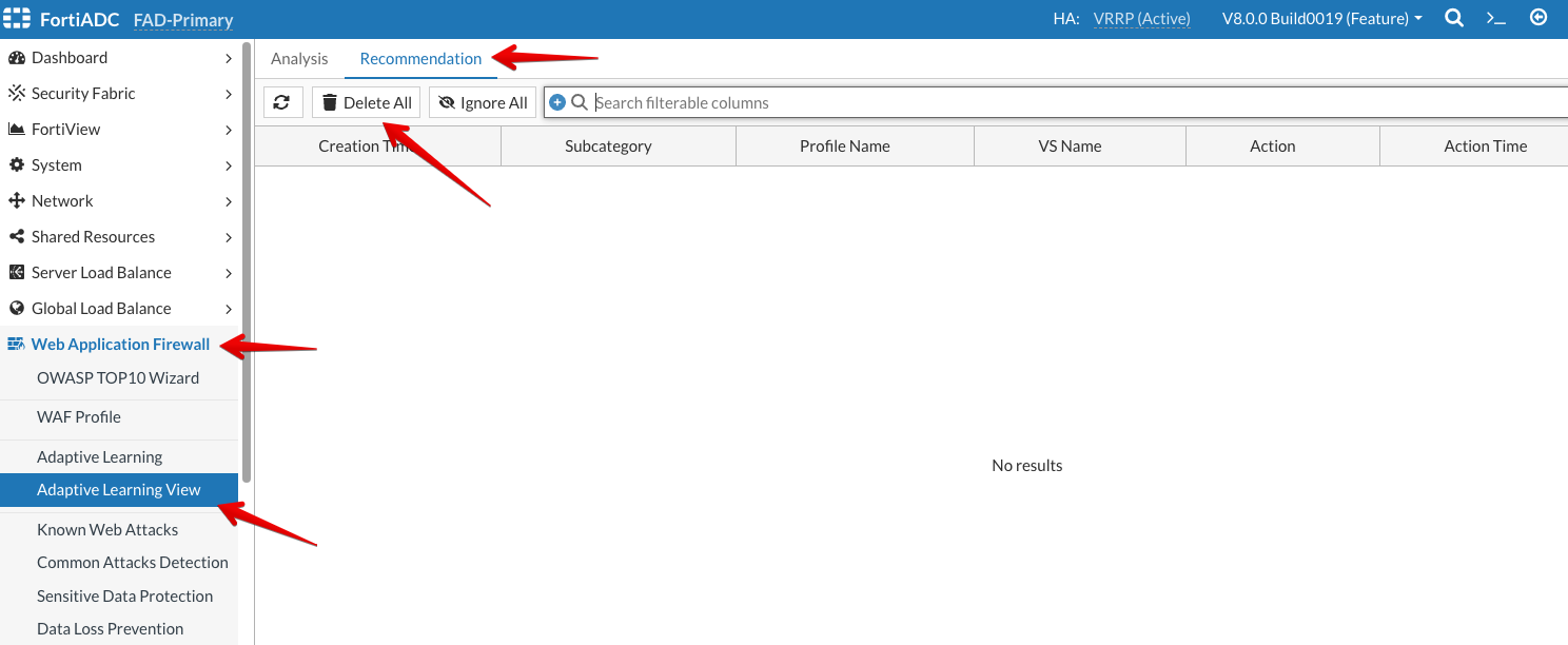 - Go to Web Application Firewall → Adaptive Learning View and delete all Recommendations as shown below.