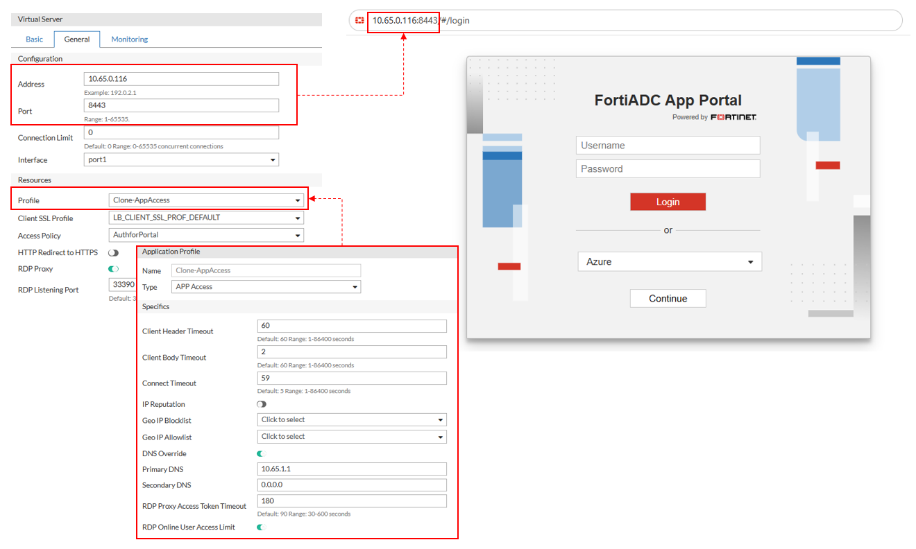 FortiADC introduces a new application profile type—APP Access—to support agentless access use cases. This profile exposes AAG-specific parameters such as RDP Proxy Access Token Timeout and RDP Online User Access Limit. When bound to a Virtual Server, it enables AAG-specific capabilities, including optional RDP proxy functionality.