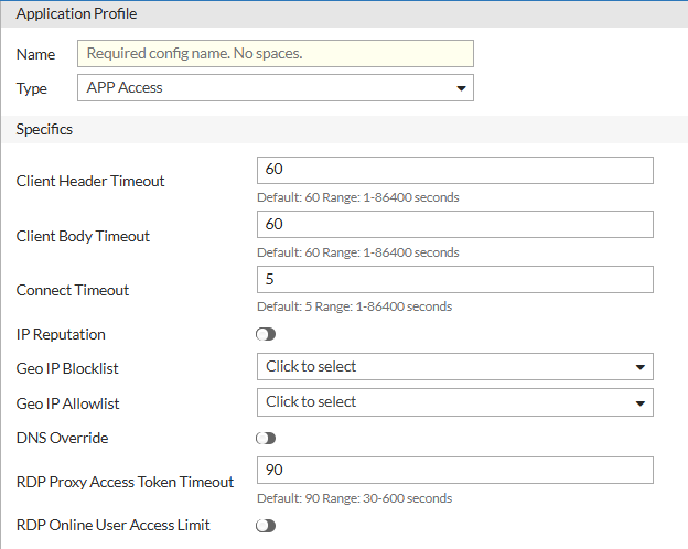 Before deploying the Virtual Server, an Application Profile of type APP Access must be configured. This profile defines protocol timeouts, DNS behavior, IP-based filtering, and RDP-specific limits for agentless access.