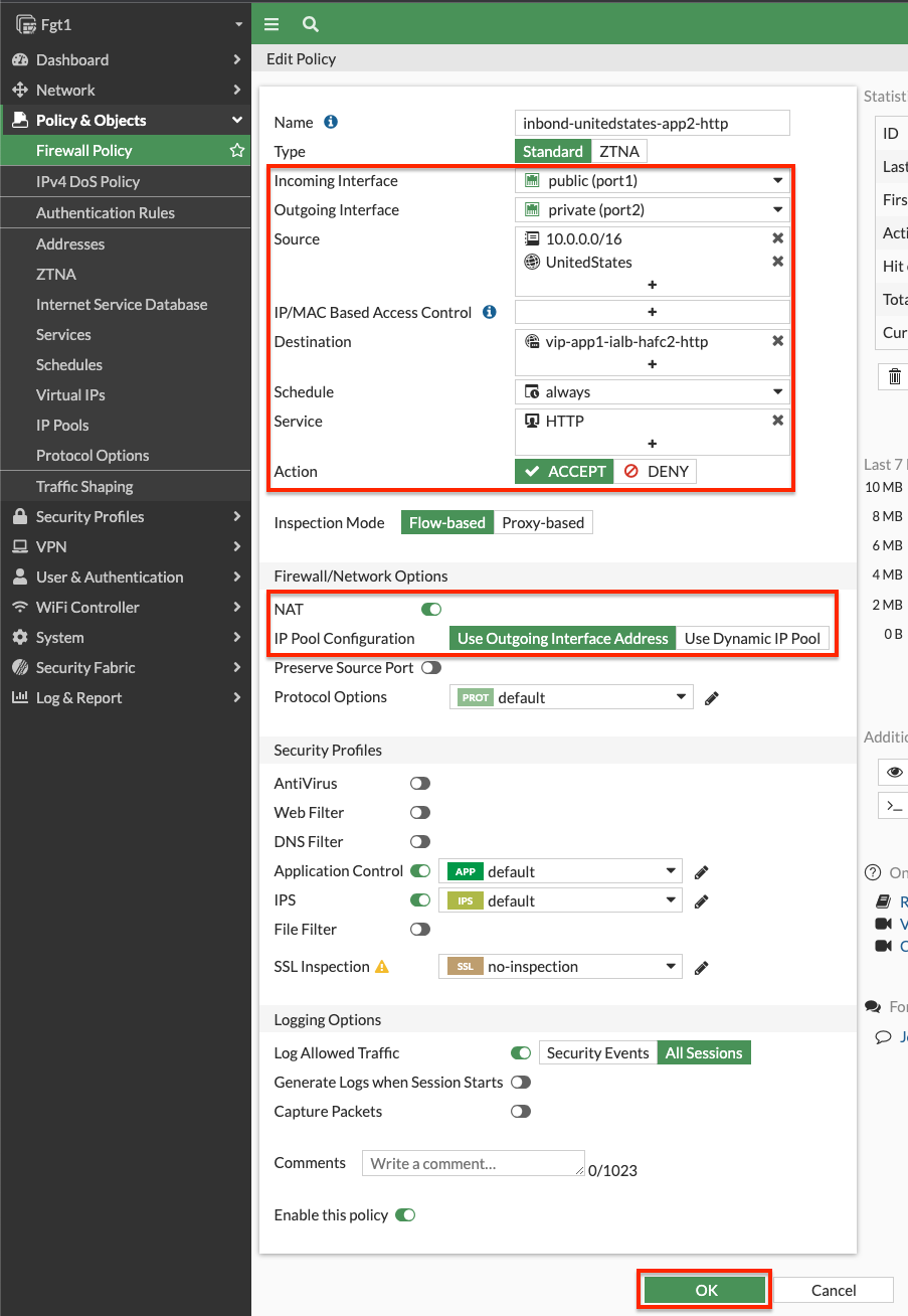 - Navigate to Policy & Objects > Firewall Policy and create two inbound policies to use the VIPs as a destination objects. Notice we are using a geography based address object to restrict the source to IPs within the United States. We also are enabling source NAT to keep return traffic coming back to the master FortiGate and not the external ALB first. Also notice we are allowing 10.0.0.0/16 as a source to allow the external ALB health checks to match the VIPs and send their traffic to the backend target of the VIPs.