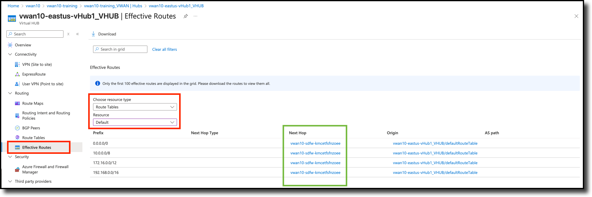 All effective routes should have the FortiGate NVA group as next hop.Note that nothing has changed in your vwanXX-eastus-vHub1_VHUB route table.