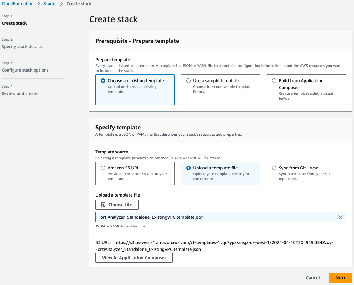 On the Specify Details page, you will be prompted for a stack name and parameters for the deployment. We are using the ‘FortiAnalyzer_Standalone_ExistingVPC.template.json’ template which deploys a FAZ into an existing VPC’s public & private subnets and gives options for configuring the instance settings.
