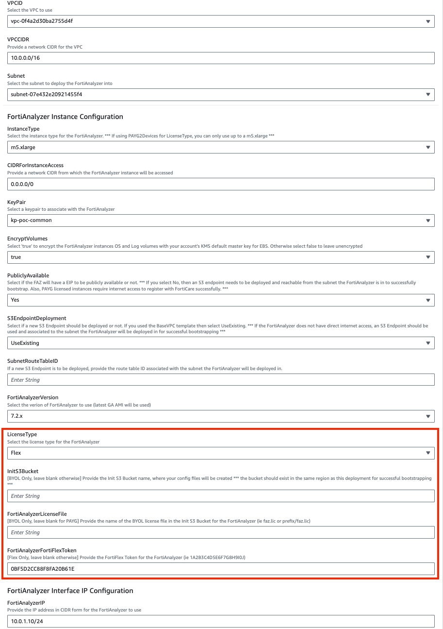 In the FortiAnalyzer Instance Configuration parameters section, we have selected an Instance Type and Key Pair to use, chose to encrypt both OS and Log disks, as well as Flex licensing. Notice we are prompted for the licensing type which we are going with tokens. In our case we do not need to fill out the InitS3Bucket parameter.