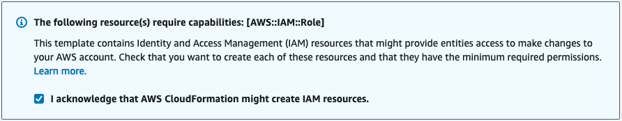 On the Review page, scroll down to the capabilities section. As the template will create IAM resources, you need to acknowledge this by checking the box next to ‘I acknowledge that AWS CloudFormation might create IAM resources’ and then click Submit.