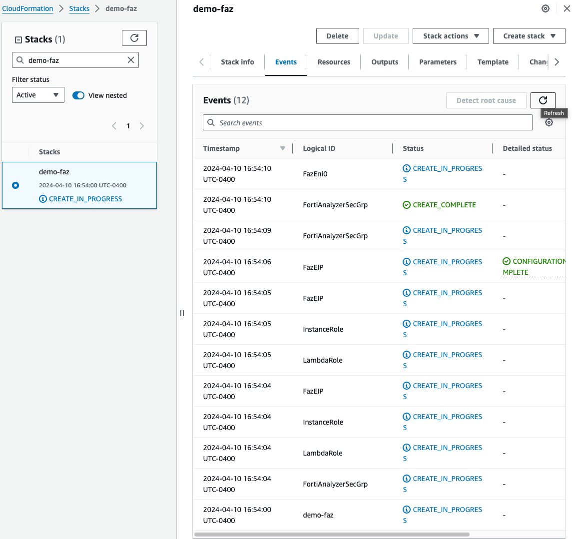 On the main AWS CloudFormation console, you will now see your stack being created. You can monitor the progress by selecting your stack and then select the Events tab.