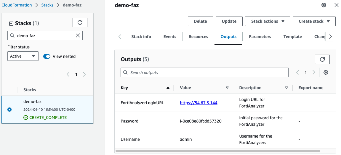 - Once the stack creation has completed successfully, select the Outputs tab to get the login information for the FortiAnalyzer instance.